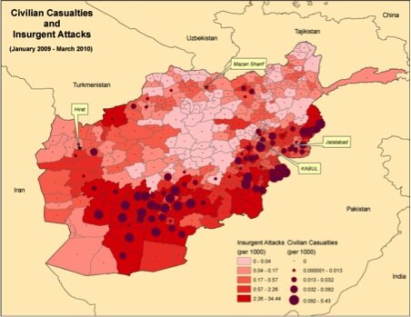 This map displays the location of civilian casualties and insurgent attacks between 2009-10. In truth, it could have been made for any of the years between 2001 until the present. The border with Pakistan is the most dangerous, and still, Pakistan is the main destination for Afghan refugees.