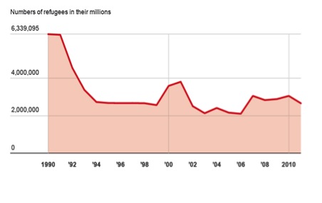 Examining the past four years yields even more startling results; the figures are erratic, and do not project a predictable stabilising or decrease in the numbers. That means that while some thousands of those two million abroad are returning home, it doesn’t look like a major trend. Even after a formal end to hostilities in Afghanistan, the average number of refugees abroad is well-above that of most other unstable nations.